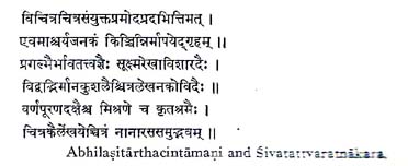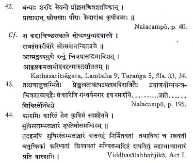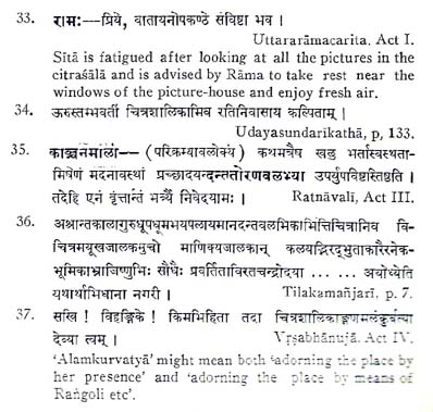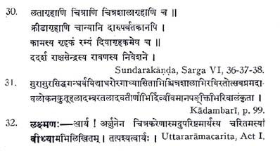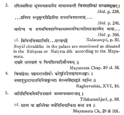 Before we consider the structure of the Chitrasala according to the Narada-silpa and try to make head or tail out of the cumbrous and corrupt text which fortunately is preserved for us at least in that form, we shall try to see what idea of a picture house we can get through references to it in Sanskrit literature. The very earliest reference to the Chitrasala is perhaps in the Ramayana. The picturesque and gorgeous description of the mighty city Lanka with its towers and temples, mansions and palaces, gardens and bowers, gateways and ramparts, fortresses and citadels, pools and ponds, lakelets and lotuses–in all, one of the very best of exquisite poetic composition and fancy in the vast realm of Sanskrit literature, and it would not be too much to say in the world's literature too–enumerates the Chitrasala amongst other pleasure-houses of the imperial palace and Pushpaka of Ravana. 30 But unfortunately we are not given anything about the structure of the picture house in particular.