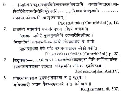 Of the third type of Chitragriha –the private one–the finest, perhaps, was the one to be seen in the house of the Panyangana (courtesan). Of the wealth and refinement of the courtesan of ancient India, the Mricchakatika is perhaps one of the very best books that present a most graphic picture. The mansions of the hetaira, of which there is a beautiful description in the Padataditaka, are adorned by so many Chitrasalas 6 and, as the Dhurtavitasamvada informs us, painting seems to have been practised very much in the Vesyagrihas to the extent of influencing those that frequented them.7 How far the art of painting was helpful to the hetaira is best understood by us when we read the Mricchakatika wherein is presented the activity of vilas, dhurtas and chetis–experts in bringing together the harlots and libidinous nagarakas–loitering about the stately mansion of the vara-vilasini, Vasantasena, with pictures of both (of vesyas and vesyakamukas) in bright and gay colours.8 But the motive for practising this pleasing art of painting as well as others of the fine-art group, music, dancing etc. is, as Ganapalita says to his friend, condemning the conduct of harlots, not for their own pleasure (vinoda), but merely to wheedle into their snare weak-minded victims by an exhibition of their special capabilities in the arts. 9