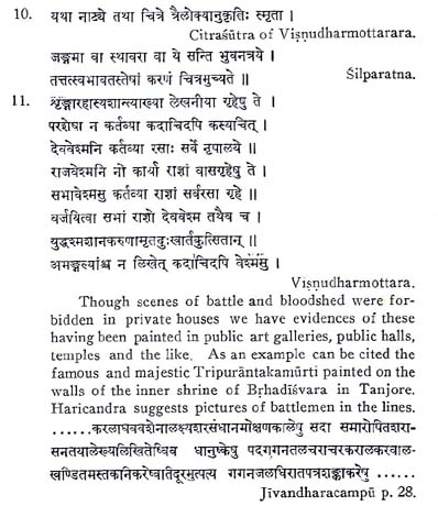 Nothing special need be said about the theme for a picture. The Vishnudharmottara, and following it the Sitpa-ratna, states that subjects from the three worlds form suitable picture themes. 10 Thus it would be nothing too difficult for us to guess that would be found in a Chitrasala. But there is a specific injunction in the Vishnudharmottara that only certain pictures–those representing sringara, hasya and santa–ought to be kept in private houses and the king’s residence.11 Pictures representing all other rasas are confined to Devavesmas, temples and the like, and the audience chamber of the royal palace. In every other place we have pictures of all types. So it goes without saying that private Chitrasalas and the Chitrasalas of the royal harem have only a limited scope. But the public galleries ought to have possessed all sorts of pictures. Of course, there appears to have been a special attachment to Mangalyalekhya and we should have had more of them than any other.