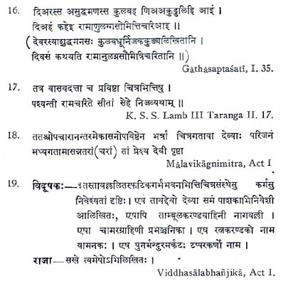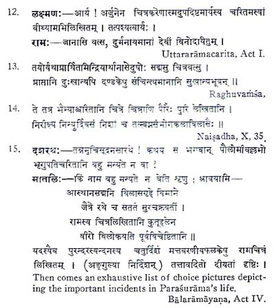 Now to go more into details, we have life histories–important incidents in one's life–painted to adorn the Chitrasala and we have an instance of it in the Uttararamacharita12 that bases itself in this particular instance on the sloka of the Raghuvamsa for this idea.13 Scenes from Damayanti’s life are painted similarly in Kundinapura.14 Though not in the Chitrasala, we have a similar painting of life incidents in the pictures of Parasurama executed on the Vimana of Indra. 15 In the Gathasaptasati of Hala we have a sloka telling us of incidents from Rama’s life painted in private Chitrasalas (on the walls of private houses) serving a very useful purpose.16 We are told in the Kathasaritsagara that Vasavadatta consoles herself by looking at pictures of Rama's life painted on the walls. 17