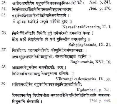 Bana gives us some idea of the pictures kept in public galleries. Demigods like Nagas, Suras, Asuras, Yakshas, Kinnaras, Gandharvas and so forth appear to have been prominently represented in picture. 22 Designs of lovely creepers and such other decorative foliage in divers hues seem to have added to the collections of the picture house. 23 Subjects of the three worlds as comprising picture themes are specifically stated by him. 24