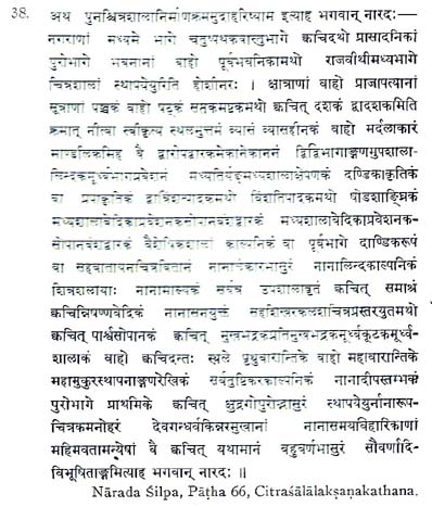 We shall now see what the Narada-silpa gives us.38 In the heart of the city or in a building situated where four main roads meet, opposite a temple or royal palace, to the east of rich mansions or in the centre of the king's highway, is to be erected the Chitrasala. A suitable spot of five, six, seven, eight or sometimes ten and even twelve sutras should be selected for the Chitrasala of either the king or the people. It may be built in the shape of Mandala (drum) or might be circular. It should have, besides one main entrance, some other doorways. The verandah about it should be double sized and there should be a smaller hall, a square terrace at its door with a flight of steps leading up to the upper storey, with a main centre-hall and side-halls. It might be club shaped or shaped after a drinking hall, and should possess sixteen, twenty or thirty-two pillars, with a staircase ending near a doorway leading to the centre-hall with a large seat thereabouts. It should have an artificial clubshaped special hall towards the east. It should further possess windows and be ornamented by a highly picturesque canopy; should have many square terraces about its entrances, many smaller halls, many seats (for seating visitors) and stairs sideways leading up. It should further be beautified by an ornamented roofing and ceiling and have Sikhara-kalasas at the top (in the form of a Vimana). In its upper hall, in an inner spot or near the main door, a big-mirror is to be placed and highly pleasing artificial chandeliers should illumine the hall. The main building should be ornamented by a small Gopura and in the hall should be kept different pleasing patterns of pictures of such Demigods as Devas, Gandharvas, Kinnaras and so forth, and also pictures of mighty men that made a mark in different fields of action, all worked in proper proportions and coloured variously and luminously with jewels all in gold. Thus spake Bhagavan Narada.