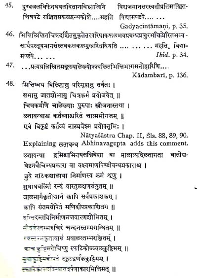 In conclusion it must be stated, however, that the Chitrasala was only the building where art was concentrated, so to say. It does not mean that other apartments and buildings were bereft of pictures and decoration. The Gadyachintamani mentions Saraswati's picture as adorning the library hall45 and the Vidyamandapa as filled with pictures of Yamaloka; 46 the Kadambari talks of pictures of the Sutikagriha47 and we have other apartments all filled with pictures. The Natyasastra of Bharata, the Abhilashitarthachintamani and the Sivatattvaratnakara speak of the Natyasala as profusely decorated with pictures.48 The chapter on chitra in the Abhilashitarthachintamani finds a place in that book, as a section dealing with an essential beautifying factor of the Natyasala. The case is the same even in the Sivatattvaratnakara which bases itself on the text of the Abhilashitartha-chintamani. After all it cannot be denied that India was saturated with art and it would be idle to contend that the very existence of a Chitrasala accounts for the restriction of art to it. It was more particularly to be found in the Chitragara and generally found in a lesser degree everywhere else. Anyway the value of the Chitragriha as a Vinodasthana was fully recognised by our ancients and it was given its own place in the life of an aesthetic citizen, Nagaraka.
