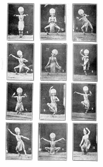 The ‘swastika’ movement in which the feet cross each other, occurs in a ‘misra gati kalasam’ of the formula ‘tai–dhi tai–dhi ti tai–dhi ti ti tai’ in which the dancer moves sideways to the right and left in accord with the syllables. This furnishes another contact with ancient dance. Figure 7 is the end of the first movement, and the entire movement may he any one of those cadences in which the feet keep crossing each other,–possibly the ‘uromandalam.’ With a touch or two Gopinath’s semi-seated posture at the beginning of his ‘garuda’ dance: may well approximate to the classical ‘gridhravalinakam.’ Figure 5 which looks like the end of the ‘karana vartitam’ in ‘vaisakha sthana’ is frequently employed in the Kathakali to denote grief. The Kathakali has a dance portrait of the elephant, and at the end of it occurs the Kathakali equivalent of the arm-movement ‘karihasta’ together with an upraised knee (fig 6). Figure 1 is the usual attitude of rest in the Kathakali and has been included for being compared with a similar posture in the nautch. Figure (2) represents something similar to the karana ‘takapushpaputam’ on a basic ‘vaisakha sthana,’ but the movements of which bear no resemblance to those of the classical cadence. Figure 11 is a combination pose,–the pose of hands of one ‘ kalasam’ having been fitted on to the semi-seated posture of another; in effect the picture appears as if the karana ‘unmattaka’ had been rendered in an ‘upavishta sthana.’ And that terrible attitude (fig. 10) in which anger has taken bodily shape,–one leg thrust forward in a pointed stride and the head and torso tilted backward to produce a vibrant line, may well represent the Kathakali recollection of the Bharata cadence ‘soochi’; an Aswatthama may very appropriately enter the stage in such a manner in quest of his father’s murderer.