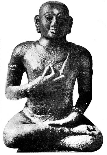 At Vallimalai8—a place which is in the heart of the country once ruled over by the Banas,—we have an image carved in relief on a rock not far from a Jaina basti which was constructed by the Western Ganga king Rajamalla (c. 870 A. D.) on his wresting the country round about from a Bana king. An inscription below the relief states that it is an image of Devasena, the pupil of the Bana king's Jain preceptor, Bhavanandin, and that it was set up by another Jain guru, Aryanandin.9 If Another early example is a figure, about a foot in height, carved in relief on the south wall of the central shrine of the Siva, temple at Tiruvaduturai.10 Beside the figure is engraved a name showing that the figure represents Tiruk-karralip-Pichchar, 11 a contemporary of the Chola king, Parantaka I (c. 907-945 A. D. ). 12 The figure holds the hands Joined in the usual attitude of salutation.