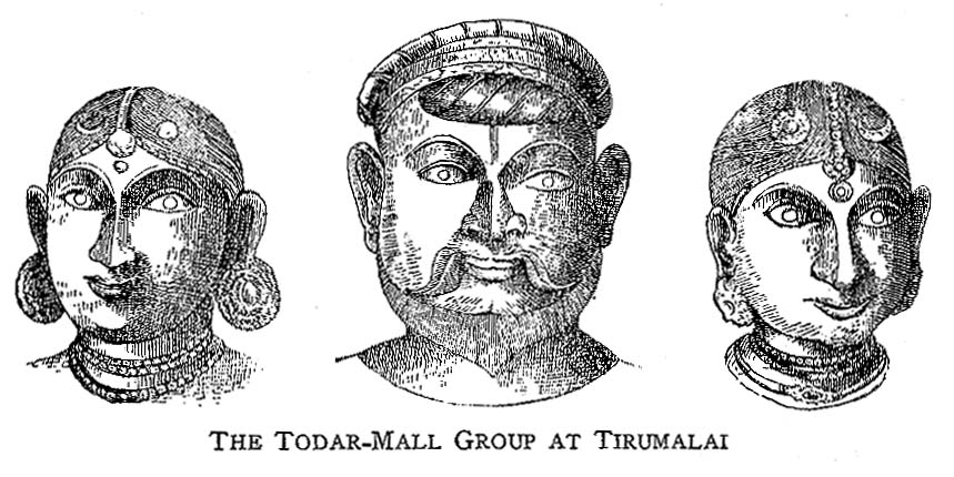 The Vishnu temples of Conjeevaram and Tirumalai have each a group of bronze statues, the central figure in each of which must have been Lala Todar-Mall. An annual festival in the Conjeevaram temple preserves an historical episode,-the southern expedition of Aurangazeb, about 1688 A.D., causing fright to the temple authorities of Conjeevaram, their removing the idol to Udaiyarpalaiyam,1 some 200 miles to the south, where the idol was placed safe under the protection of the local chief, his refusal on the subsidence of