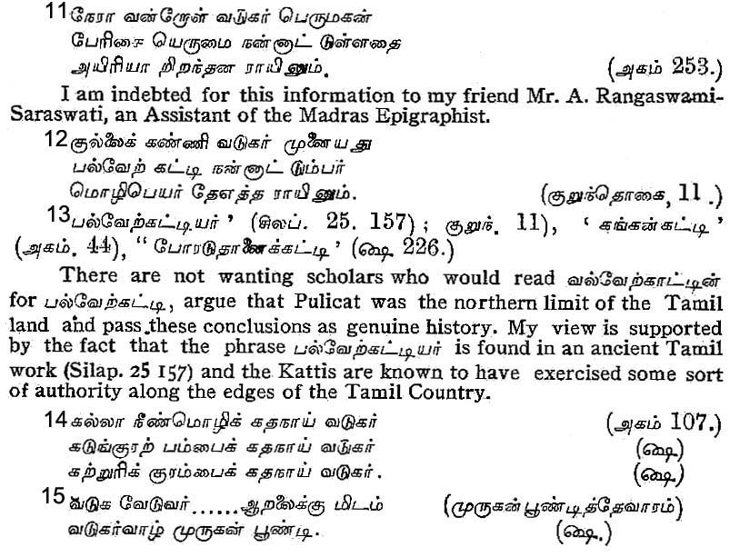 If these be so, it follows that the Telugus who were to the north, and the Badaga Kannadas who were to the west, of the Tamils were known generically as the Vadugar. The poet, Ma-mulanar, says that it is beyond the lands of a chief of the name of Katti that the language changed into that of the Vadugar.12 Perhaps the chiefs well-known as Katti-Mudaliyars in the days of the Vijayanagar empire and later belonged to the lineage of this Katti.13 It is worthy of note that these Katti-Mudaliyars occupied those portions of the Tamil country which Ma-mulanar assigned to Katti. There are reasons to hold that the land called Vadugar-munai and placed beyond the lands of this Katti is identical with the Badaga-nadu we have already mentioned.14 It is these Badagas that seem to be referred to by St. Sundara in one of his psalms on a shrine in the Kongu country.15