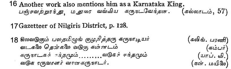 In Vembatturar's Tiru-viliaiyadal Puranam the Jain king who captured Madura is called in one place 'the Karnataka king' and at another place as 'the Vadugu king'.16 These references show that the term Vadugar was also used to devote the Kanarese, some of whom seem latterly to have settled in the Tamil country.17