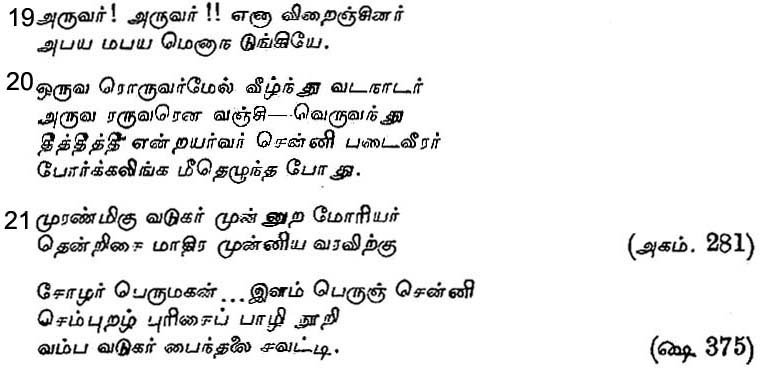 No evidence is forthcoming to show that the Andhras styled themselves Vadugar. So too, the Tamils never called themselves Aravar, though a lexicographer who lived so late as three centuries back chronicled that word indicated the Tamils. To the ancient Andhras the Tamils were known not as Aravar but as Aruvar. When "]ayam-Kondan describes the terror which the Tamilian army of Kulottunga-Chola struck into the hosts of the Kalinga king, he says that they applied the name Aruvar to the Tamils.19 That it is only the term Aruvar which was current in early times is clear also from an old stanza on the same war quoted in the Dandi-Alangaram.20 These instances establish that the Andhras called the Tamils in early days by the name of Aruvar. Those regions of the Tamil land which adjoin the Telugu country are Aruva and Aruva-vada-talai and the people of these regions were known as Aruvalar. We may therefore take it that the Vadugar applied the name Aruva first to the people of these regions and then applied it generally to all Tamils.