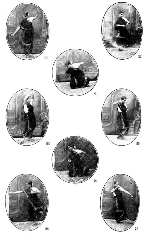 ‘Tillana’ brings us to the end of the dance programme of the Nautch. Barring the ‘alarippu,’ this is the most captivating item of pure dance, not sensuous by any means, but infinitely aesthetic and one that should be awaited in pleasant anticipation. The early sections of it resemble the ‘jatiswara’ very much in the ‘griva’ and ‘kati’–rechakas’ and the sculpturesque forward movements (fig. 15); suddenly the structure changes and a few simple cadences epitomise all the queenly majesty of woman, all her airs and graces, glances and turns of head in a most vivid and intriguing manner; one moment she is gracious and smiling; suddenenly he turns away in exquisite caprice vouchsafing the vision of her barest profile to reappear under guise of an entirely different mood (fig. 22); and like a musical artist who alternately conceals and reveals the ‘raga’ in rendering the ‘tana; she places the forefinger of a ‘soochi ‘ hand on cheek roguishly in terms of the ‘gandasoochi–karana’ (fig. 25) and beats a slow retreat concealing and revealing her face as she moves along; in an access of playfulness she returns again and permits a vision of her half-averted face in a framework of uplifted and interlocked ‘nritta-hastas’ (fig. 23); in sheer delight she lifts one foot and darts a hand across in hasty recollection of the karana ‘valitam’ (fig. 26); now she plays a whimsical male role in executing the karana ‘parsvajanu.’ If the visible arts of painting and sculpture based themselves on Natya and drew their sustenance of true rhythm from its ‘sthanas,’ the ‘tillana’ provides an instance of Dance borrowing the ‘sthanas’ of Painting–the full, half and three-quarter views for its own ends. ‘Kinjin’ corresponds to the ‘tillana’ in the Southern dramatic tradition; and it is said of Sitarama Bhagavatar of Soolamangalam, an expert in feminine dance and a consummate master of the art of revelation in concealment that hundreds of professional dancing girls would hasten to witness his renderings to learn therefrom. And the story teller adds that this super-artist had the highest admiration for the art of Ammalu of Pudukkottah. What a marvel of marvels this Ammalu must have been.