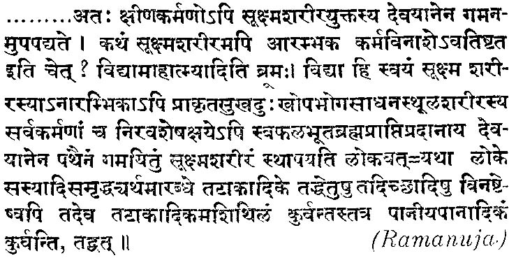 This conclusion is reinforced by a consideration of Ramanuja's own commentary. His final position is the same as that of Nimbarka, that the meditation of Brahman (Vidya) by its potency secures a subtle body for the devotee, where- with he proceeds on the Path of the Gods. The illustration given by him is, however, different. He is interested in proving that a body of some kind is possible even in the absence of Karma; and Vidya though by itself incapable of bringing a body into existence, is yet capable of conserving a body once created; Vidya then conserves the subtle body, even when the gross body and the Karma which caused it are destroyed. This is analogous to a tank originally dug for irrigation purposes continuing to exist and serve a different purpose, that of supplying drinking water. This is not the illustration noticed by Srikantha in his statement of the prima facie view. It cannot be concluded, therefore, that he either ignored the view or that he preceded Ramanuja; for he does notice Nimbarka's illustration and Nimbarka is believed to have succeeded Ramanuja.