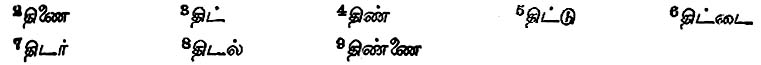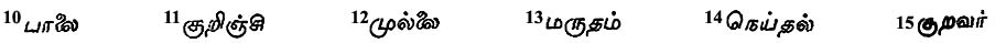 The ancient Tamils noted that the habitable parts of the earth's surface were divisible into five regions or Tinais2 as they named it. Tinai seems to be derived from a root tit,3 or tin,4 which means a stretch of land and has given birth to the words tittu5 a sand-bank, a little hill, a dry spot in a river bed, tittai,6 tidar,7 tidal 8 a sand-bank, a flat shoal, highland, tinnai 9 a raised platform. The root tin also means strength, firmness, and the word tinai, was used also in the sense of the earth in general. The ancient Tamils observed that the land-surface of the earth consisted of five natural regions and the manifestations of human life were conditioned by the characteristics of the milieu in which the tribe has grown. The five tinais were called (I) Palai, 10 dry waterless sandy regions, (2) Kurinji,11 the hill country (3) Mullai,12 the jungly tracts that intervene between the uplands and the lowlands, (4) Marudam,13 the lower courses of rivers, the peneplain worn down by centuries of erosion till its level has become approximately the same as that of the river in flood, and (5) Neydal,14 the littoral tract, that which skirts the sea. All these five kinds of natural regions are found in the Tamil country, though in a small scale, and as man has continuously inhabited South India since he first appeared on the globe, he successively passed from region to region and developed therein the stages of culture which each was calculated to produce.