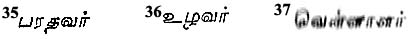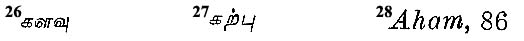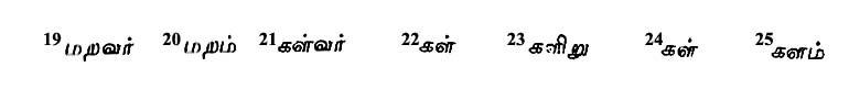 Besides cooking and clothing, another great invention of man is speech. Speech may be either rhythmic or arhythmic. Whether prose preceded poetry in speech as is assumed by most people, or whether, as is more probable, poetry and prose were later differentiations of an original method of speech which was partly rhythmic and partly arhythmic, it is difficult to determine; but it is certain that in the development of literature, poetry preceded prose by long ages. The words pan38 and pan39 meaning, a piece of music, (whence padu, 40 sing, pattu,)41 belong to the earliest stratum of Tamil, thus proving that singing was one of the earliest recreations of the Tamils. The panar,42 originally singers and after the institution of kingship in the pastoral stage of culture, royal bards and panegyrists, followed an ancient and honoured, though ill- rewarded, profession among the Tamils. The ancient panars were the friends and counsellors of kings during the long ages when the pure Tamil culture flourished, but when Aryan culture from North India mingled with that of South India during historic times, the persistence of the panar in the over-indulgence in meat-fold and drinking of ardent spirits brought about their social degradation into one of the lowest and most untouchable castes of South India.
