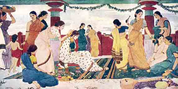 In 1914 my students produced two scenes from Julius Caesar. I designed two back curtains for these scenes and Ram for the most part painted them,–they were still in the College when I left. We worked in a class-room of the Training College. I was surprised at Ram's mastery of the technique of scene-painting. He had learnt it from the scene-painter of the local theatre, whom I knew as Mr. Ram, and whose work must have done much to turn his young namesake's thoughts towards pictorial expression. Mr. Ram had clearly a strong natural artistic gift, but he studied, of course, the taste for exuberant decoration then current in theatrical circles. His flamboyant painting contrasted oddly with the quiet power and refinement of his comic acting, or rather character-acting, which would have made him famous, I used to think, in any other country. One of our curtains represented the Senate House where Caesar was murdered, and Pompey's statue, larger than life, was to be painted on it from a small design which I had prepared. To enlarge this to the requisite size was beyond even Ram's draughtsmanship at the time, nor did I succeed any better myself. Damerla Venkata Rao, who was looking on, came to the rescue, and outlined the design perfectly on the larger scale with a free-hand ‘in no time’ as they say. This seemed to me to show a remarkable power of eye and hand. Just so much of the painter's gift Venkata Rao had in a remarkable degree. My account may for the second time seem to be wandering from its theme, but this I do not admit. We are members one of another, and Ram's gifts and work alike can be better understood in the light of a knowledge of the relevant gifts and interests of his relations and early associates. Artistic gifts, graphic and visual, are evidently prevalent in Ram's family. Some work, which I saw by a maternal uncle of his, seemed to me very delicate and remarkable in the barren artistic environment of his time. Ram's sister's work is well known and will, I hope, be better known.