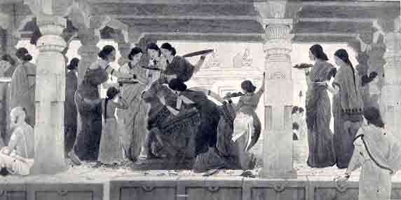 Others, it seems, reacted otherwise. "Even though the subject-matter be Indian, as when Indian figures are put into the framework of an Ajanta Vihara, there is a total failure to seize the spirit of Ajanta and to create a true Indian atmosphere. These figures are Indian studio models posed according to European academic rules, arranged mechanically in Leightonesque attitudes in a decorative pattern, but they are wholly un-Indian in thought and unnatural in expression. The artist is bound hand and foot by a scholastic tradition foreign to his own nature and is unable to find himself." Thus the (English) father of the Calcutta School dismisses (Rupam, January 1925, the month before Ram died) the Bombay exhibits at Wembley. It is an obvious caricature of the Nandi-Pooja and Ram's other pictures; but horribly stuffed as it is with epithets of war, I doubt if it means much when analysed except that, for Mr. E. B. Havell, any reminiscence of Leighton (who is out of fashion in the West) destroys ‘that Indian feeling’. Leighton for him means South Kensington, studios, models, academic rules, a dead scholastic tradition, mechanical arrangement and all that. For Rama Rao Leighton stood for something quite different. He stood for the fresh and wonderful art of Greece and for the living world behind it, which was nearer to Ram's than it could ever have been to Mr. Havell's. This after all is the natural response of a youth in Ram's position, a born visualizer and artist who knows nothing of fashions and fopperies, the satieties and sentimentalities of Paris and London. It was not an attitude foreign to his nature imposed upon him at the Art School. The Art School merely taught him to do what he had dreamed. I happen to know this, but my testimony will not appear surprising to anyone who conceives the situation dispassionately.