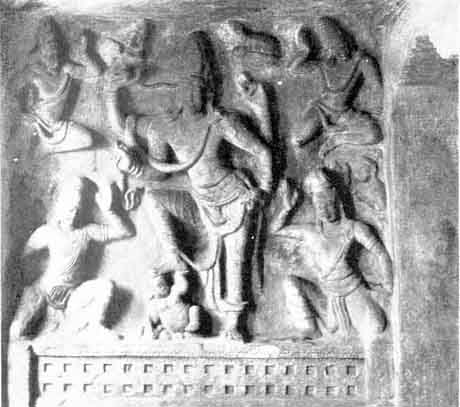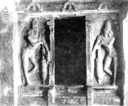 This group deviates in some respects from the directions contained in the works on sculpture, but the result does certainly justify the deviation. As in all Indian Art, it is the central figure that evokes admiration: if examined part by part, the figure is by no means striking; but so skilful is the composition that the figure emerges almost as a masterpiece. For strength and firmness one may wander far and not easily find its like. It is true that this panel cannot stand comparison with the magnificent group at Elephanta dealing with the same theme, though on a different conception of it: none the less, this piece of sculpture reduces the events to the merest essentials and keeps Siva in the forefront. For serenity of pose and expression it is hard to find a parallel, either earlier or later.1