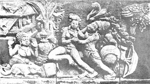 Plate II portrays the fight between the brothers Sugriva and Vali in which the latter was killed by Rama hidden behind a grove of trees. On the left behind the grove are Rama and Lakshmana, the former in action. On the right Vali and Sugriva are engaged in their deadly fight, the latter wearing a wreath of leaves to enable Rama to distinguish him. And Rama being guided by this wreath has discharged his fatal arrow which is seen fast approaching the ill-fated Vali. Between the parties, the fighting brothers on one hand and the divine brothers on the other, is the seated figure of a forester watching with interest the fight.