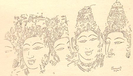 Under the rule of the Hindu kings, rulers of a high intellectual calibre, enlightened in a very true sense, delighting in the encouragement of a thousand arts like dancing, painting, sculpture, architecture, music and poetry,–to mention only a few,–there was all the possibility of the best in every art exhibiting itself; and it is such a living monument of the best execution of form in line and colour by some unknown artists of the royal court of the Chola kings of Tanjore, peeping through the dust and dilapidation of encrusting coatings some centuries old, on the walls of the dark and dismal passages round the Garbhagriha of Lord Brihadeswara, and dwelling practically on untrodden ways to waste its sweetness in the darkest gloom, that made me wonder at the mighty skill and the marvelous workmanship of those cunning craftsmen of old whose value and worth have so long been a sealed book to the world around.