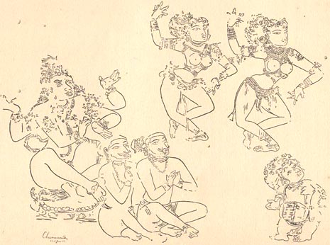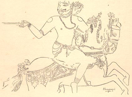 Shortness of time and physical indisposition denied me the pleasure of copying some more of these wonderful masterpieces that form an exquisite ‘Deyakula Chitrasala’. But the regret is more than balanced by the sense of their being typical representatives of the most noteworthy elements of that magic conception and workmanship that stand there on those walls of the unfrequented passage, to inspire and guide willing recipients of art knowledge and culture who approach them with humility and love that cleanse and purify the disciples’ heart and turn it into a spotless receptacle, pure and crystalline like a limpid sheet of water in a lake.