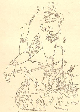 The picture of Vishnu painted close by as keeping time is another type of the ‘Mahapurusha’, the knowledge of whose ‘lakshana’ is so essential in the case of every Indian artist who professes to work in the traditional method. The subtlety and grace of the lines that gently indicate the movements of the limbs is well worth noting in this as well as the other figures in the picture. As for the ‘bhaktas’, one of whom similarly keeps time by a sounding of the cymbals, and the other merges himself in that divine harmony of sound and action, we see pure piety written plainly on their faces. The quaint little figure of the dwarf playing the part of the grotesque drummer is very often met with in Sanskrit literature in the person of the famous ‘kubjas’ and ‘vamanas’ so absolutely essential in royal equipages and households and peeping out of any group of pictures and carvings of ancient India discovered in any part of our land. The epithet ‘Vismayalolita maulih’ used ironically in the case of Bhattaputra in the Kuttinimata of Damodaragupta and the sarcastic verse,