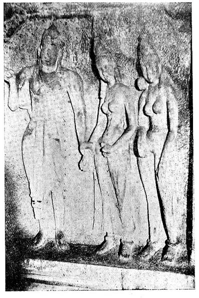 In another of the rathas a king stands in one panel [Fig. 7] looking at two ladies in the next panel, one of whom is a, queen [Fig. 8]. The posing has improved greatly, the arms and the hands are no longer inconvenient out-growths and the expression shows that the artist has striven to obtain fidelity to life: indeed the execution is very happy. We have unfortunately no means of deciding with certainly whom these figures portray.