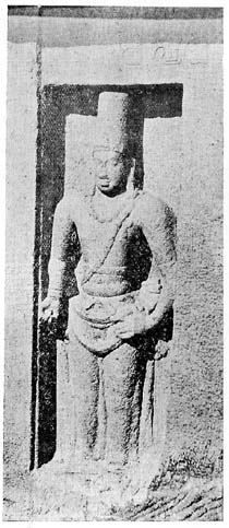 On the outer face of the famous monolithic temple called the Dharma-raja ratha are carved a number of figures with inscriptions above them, - all of which are the birudas or titles of the Pallava king Narasimhavarman I (625-650 A.D.)14 - son of Mahendravarman I. Below one of these inscriptions is an alto-relief [Fig. 5] which, if we may base a conjecture upon the titles blazoned above and around, might be a representation of this king Narasimhavarman I.