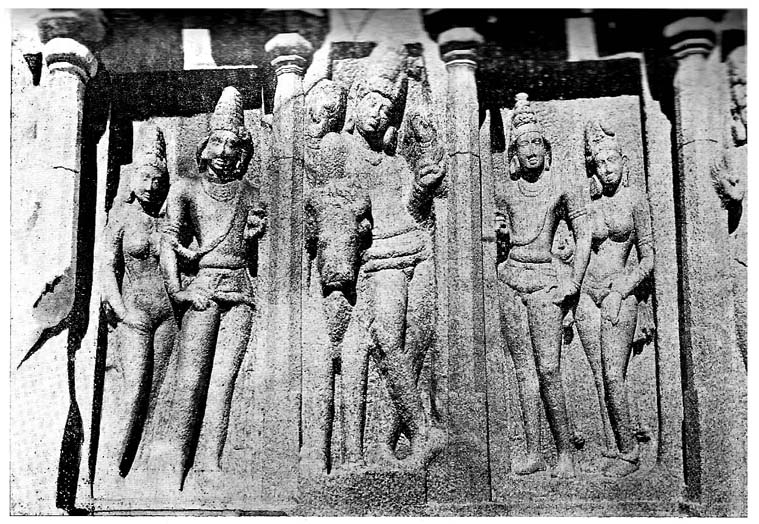 Round the central shrine of the Vaikunta-perumal temple at Conjeevaram 17 runs a raised verandah the walls of which bear two belts of panels of bas-reliefs, with spaces below for labels. Only some of the spaces have been filled in with labels explanatory of the pictures and even these are not quite intelligible in the present state of our knowledge of Pallava history, 18 but the panels and the labels seem to 'represent the whole history of the Pallavas in pictures.' 19 The temple was built by Paramesvaravarman I (c. 675 A.D.) and finished by Nandivarman-Pallava-malla (c. 742 A.D.)20 but we do not know if these kings contented themselves with picturing the puranic history of the dynasty which is set out in some detail in its inscriptions or whether they sought in these panels to bring the history down to their own times. We seem, however, to have in some of the panels and the subjoined labels an attempt to delineate and describe the incidents which led to the succession of Nandivarman-pallava-malla on the death of Paramesvaravarman II. These panels have not been studied adequately for want of full knowledge of the life and events of those days and we cannot therefore decide if we have any portraits in them.