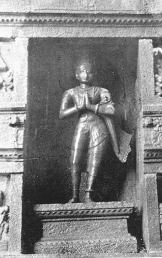 Some of the figures, such as those of Gandar-Aditya, the Chola captain, and all the Madura Nayakas, except Tirumala Nayaka, were carved and set up after the death of the persons represented. If tradition speaks true, Tirumala set up statues to three generations of his predecessors on the throne and the citizens of Srirangam set up likenesses of persons who had died some twenty years before. But many of the statues were set up in the life-time of the subject himself, as is evident from the history of the Satakami relievos and as is expressly stated in respect of the image of Mahendravarman at Trichinopoly and the bronzes which the devotees of Annur, Tirukkannapuram and Kalahasti gave a way along with their gifts for perpetual lamps. Almost all the hagiologists who speak of images being installed in the likenesses of the great Vaishnava Acharyas say that they were set up while they were yet alive. But, one of the chronicles says that Ramanuja felt very weak at the time when his image was being consecrated at his birth-place, ptrhaps because his' powers' were being transplanted from his body into the image. Another hagiologist records that though Vedanta-Desika cast his own image, yet he had it stowed away because of its supreme perfection as a likeness. These two accounts suggest that it was considered hazardous to set up a statue in the subject's life-time, and especially so if it was a good likeness, but we have irrefragible proof of a practice, dating at least from the times of the Satakarni relievos, of living persons being represented in portraits.