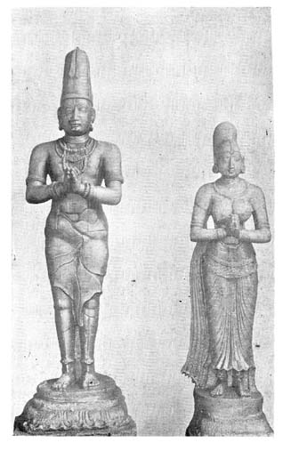 Mention, but no more than mention, has to b made of another class of sculptures of which specimen fill practically every south Indian temple to Vishnu or Siva. In the Tamil copntry every Siva temple contains a set sixty-three images representing the sixty-three Nayanmar or Saints of Tamil Saivism and every Vishnu temple contains a group of sculptures of the Alvars or the Saint and the Acharyas or the Preceptors of Tamil Vaishnavisn. These images are certainly considered portraits by the pious but a study of any two sets of images makes it palpable that though portraiture might have been intended it was not achieved, except occasionally in the case of the image of so eminent a personality as Ramanuja. A posture or a symbol was originally associated with each saint and every generation of sculptors has followed the convention without attempting to give to each figure an individual expression. The Alvars, the Acharyas and the Nayanmar are not portrayed in the sculptures with any greater fidelity to historic truth than the Buddha or the Boddhisattvas are represented in the numberless paintings or carvings of Buddhist art, of the Tirthankaras in Jain art, of the Lamas by Tibetan artists, or of the Madonna of the christians.