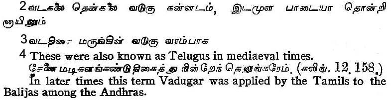 The famous commentator Nachchinarku-Iniyar and the author of the old commentatory on the Nannul state that of the lands surrounding the Tamil country those in which Kanarese, Vadugu and Telugu were current were distinct entities.18 The Telugu country being treated as distinct from the Vadugu country, we have justification for holding , that they had the Badaga country in mind in drawing the distinction. Otherwise we should have to suppose that they treated the northern part of Andhra as the Telugu land and the southern part as the Vadugu land, and seek support for this view in the fact that the Tamil country itself was divided into the Sen-Tamil and the Kodum-Tamil lands. However this may be, the later Tamils ignored what distinction there might have been and applied the terms Vadugar and Vadugu to the Andhras and theAndhra language.
