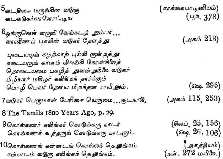During the Sangam period the Tamils knew the Andhras under the name Vadugar4 and their language as Vadugu. Similarly, the Telugus called the Tamils by the name Aravar and their language Aravam. The word Vadagar is only a variant of Vadugar, a northerner. Just as the country to the west (Kudakku) became Kudaku so the country to the north (Vadakku) became Vadagu and, later, changed to Vadugu.5 This derivation is also indicated by the lines of Kakkai-padiniyar already quoted and by the phrase 'Vadugar of the North' in another work of the Sangam age. It seems that even in the times of the Last Sangam the country north of the Venkata Hills was considered the country of the Vadugar. 6