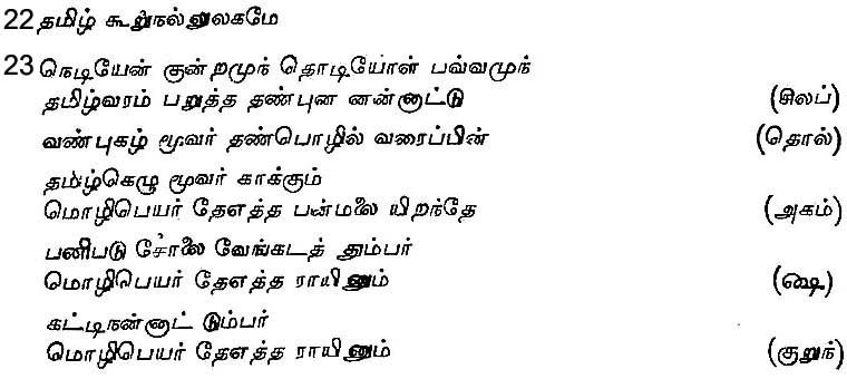 If Tamil, Telugu and Kanarese belong to one class, which language is the parent? One may confess to an inability to offer a solution acceptable to scholars in general. There are some amongst us who hold that Tamil occupies that relationship. It is accepted on all hands that Tolkappiyar's Tolkappiyam is the earliest and most authoritative. This work divides the country where Tamil is current into twelve divisions and classifies the words that come from lands like Vadugu beyond those twelve divisions as words of foreign origin. Panam-paranar too, a contemporary of Tolkappiyar, describes the Tamil land as limited on the north by the Venkata Hills and does not claim that its domain extended further beyond. Kakkai-padiniyar, also an ancient Tamil poet, mentions distinctly that Vadugu, the land where the Telugu language is current, formed the northern limit of Tamil.3 It will thus be patent that long before Tolkappiyar's times Tamil and Telugu had been current side by side as two independent languages. To judge by the Tamil literature now available, Telugu would seem to be entitled to an antiquity equal to that of Tamil.