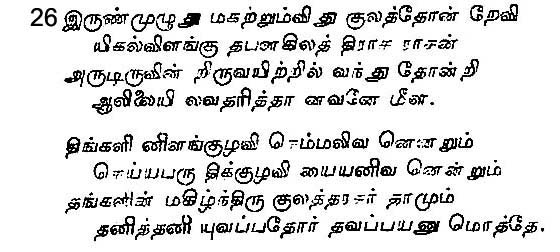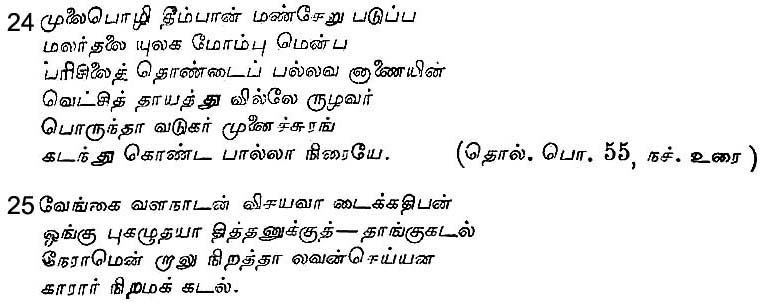 No evidence is forthcoming to show that the Andhras styled themselves Vadugar. So too, the Tamils never called themselves Aravar, though a lexicographer who lived so late as three centuries back chronicled that word indicated the Tamils. To the ancient Andhras the Tamils were known not as Aravar but as Aruvar. When "]ayam-Kondan describes the terror which the Tamilian army of Kulottunga-Chola struck into the hosts of the Kalinga king, he says that they applied the name Aruvar to the Tamils.19 That it is only the term Aruvar which was current in early times is clear also from an old stanza on the same war quoted in the Dandi-Alangaram.20 These instances establish that the Andhras called the Tamils in early days by the name of Aruvar. Those regions of the Tamil land which adjoin the Telugu country are Aruva and Aruva-vada-talai and the people of these regions were known as Aruvalar. We may therefore take it that the Vadugar applied the name Aruva first to the people of these regions and then applied it generally to all Tamils.