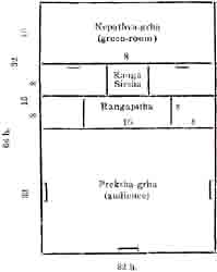 As regards the entrance gates to the audience-hall, Abhiava says that they may be three, perhaps one on each side. In the rectangular ‘the head of the stage’ is a little higher than the ‘stage proper’ while, in the square, both are on the same level.