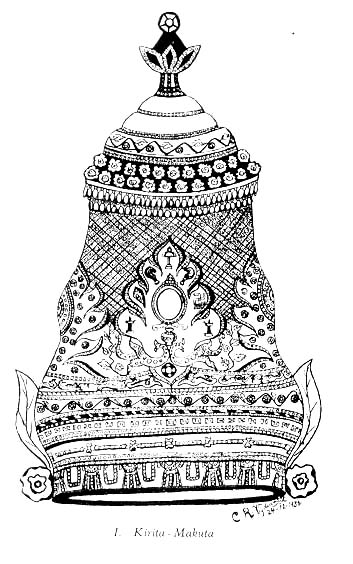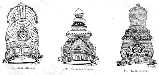 The common name of all head-gears used in the text is makuta or mouli and it classifies them into the following: - 1. Jata-mouli, 2. Kirita-mouli, 3. Karanda-mouli, 4. Sirastrakam, 5. Kuntalam, 6. Kesa-bandham, 7. Dhammillam, and 8. Alaka- chudakam. Apart from these it mentions also 9. Patra-pattam, 10. Ratna-pattam and 11. Pushpa-pattam. Only the first four are crowns, properly speaking, while the next four are only the modes of dressing the hair, while the last three are really ornamental bands, though Pattam is a word commonly used with reference to diadems in general, and the crowning ceremony as Pattabhishekam, the queen associated with it being referred to as Patta-Mahishi or Pattarani.