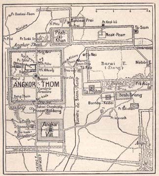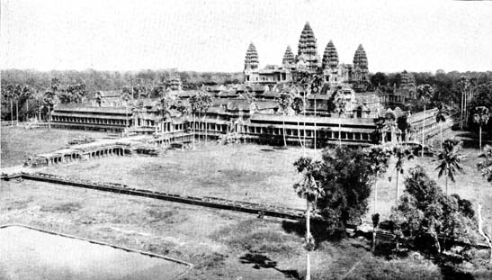 I add in conclusion a little summary concerning the way to reach Angkor. There are two routes to Angkor. The more convenient one for travelers who cannot speak French is through Bangkok in Siam. From Bangkok there is a train to the border town of Aranha. The railway line ends there, and the Province of French Cambodia begins. Angkor is 100 miles from Aranha, and the travel agencies arrange for motor cars, with guides who are Indians and speak English, French and the vernaculars. The second route is from Saigon. Everything in the city is French and there is scarcely anyone who speaks English. There is no railway line to Angkor but there are good roads. The distance is 292 miles, and the trip takes the whole day, with the necessary stoppages. A motor bus starts early in the morning, and is usually crowded. It arrives at Angkor between 6 and 7. Private motor cars can be engaged and do not take much less time, though more comfortable.