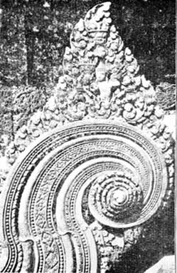 In all the carvings at Angkor, and in the monuments near by at their best period, there is a theme which is very significant. It is represented by Fig. 4. Again and again this is worked out in very beautiful forms. We find it also In Fig. 5, which reproduces a Devi. On the right side is a very beautiful panel in sandstone. One characteristic of all the work at Angkor Vat is a beautiful fineness and finish which one rarely finds in Indian temples built of granite.