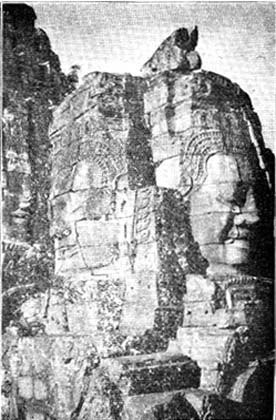 The city of Angkor Thom is a square, and has four gates to the cardinal points, with an additional gate which was the gate through which the dead were taken out. The moment one comes to Angkor Thom, one is impressed by a new idea in architecture, and that is the enormous faces which are over the four gateways, and specially which are over all the cupolas of the temple at the centre of the city, which is called Bayon. These faces are huge, some 9 feet high, as those over the gate. The others in the cupolas of Bayon vary from 5 feet to 7.5 feet (Fig, 6). In this temple there are 160 of these faces in groups of four making each cupola. These enormous faces have a curiously hypnotising effect by their repetition, and some tourists find them a little bit frightening, even though the temple is now in ruins. Archaeologists say that originally Angkor Thom was dedicated to the cult of Avalokiteshwara, and that soon afterwards, when the Hindu kings once again reigned, the faces were ascribed to Shiva.