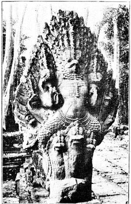 Another new idea is at the City gate. On either side of the gate is an enormous Naga, with a highly decorative head carved in stone. This Naga is held up by a large number of giants, and the length of the snake must be nearly 100 feet. For many years the French experts considered that Angkor Thom was earlier in structure than Angkor Vat, but during the last three years it is now settled that Angkor Vat is the earlier structure. This is borne out by the fact that at Angkor Thom the sculptural work is rather hurried, and lacks the fine artistic ensemble which impresses one at Angkor Vat.