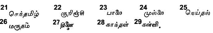 The ‘Kurinji’ people were a warlike race of sturdy; huntsmen, living mainly by hunting diversified by the cultivation of ‘Thinai’27 grain and the practice of cattle-lifting. Their tutelary deity was Muruga. The most prevalent trees were the Teak, the Sandalwood, the Akil, the Vengai and the Asoku; the characteristic flowers, the ‘Kurinji’ and the ‘Kandal’28 the familiar beasts, the lion, the tiger, the bear, the elephant and the boar; and the common birds; the peacock and the parrot.
