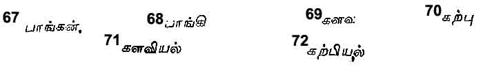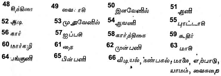 The first two months of the year, ‘Chittirai’48 and ‘Vaikasi’49 comprise the ‘Ila-venil’50 or spring season, the next two months of Ani51 and Adi,52 the Mudhu-venil53 or summer season, the next two months of Avani54 and Purattasi,55 the Kar,56 or rainy season, the next two months of Aippasi57 and Karthigai,58 the Koothir59 or cold season, the next two months of Margali60 and Thai,61 the Mun-pani62 or the season of the evening dews and the last