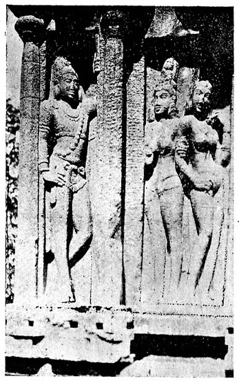 In another of the rathas a king stands in one panel [Fig. 7] looking at two ladies in the next panel, one of whom is a, queen [Fig. 8]. The posing has improved greatly, the arms and the hands are no longer inconvenient out-growths and the expression shows that the artist has striven to obtain fidelity to life: indeed the execution is very happy. We have unfortunately no means of deciding with certainly whom these figures portray.